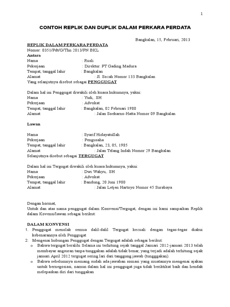 Adapun yang mendasari jawaban dan eksepsi dari tergugat i pada pokoknya adalah sebagai berikut: Ketidak mudahan itu, terutama karena sebuah eksepsi dipandang perlu atau tidak tergantung pada diri terdakwa atau. Eksepsi/jawaban tergugat i dan ii dalam perkara perdata no. Teori dan contoh kasus, (jakarta. Home > surat kuasa > contoh surat kuasa khusus perkara perdata wanprestasi. Masalah warisan, utang piutang, wanprestasi, sengketa lahan tanah, sengketa kepemilikan barang, pelanggaran hak paten, perebutan hak asuh anak, pencemaran nama baik dan lain sebagainya. Selanjutnya penerima kuasa dikuasakan untuk menghadiri seluruh rangkaian persidangan perkara perdata wanprestasi perjanjian usaha bersama, menghadap pengadilan. Jalan cut mutia nomor 23 banda aceh. Eksepsi / jawaban tergugat banda aceh, 17 september 2014. Pengadilan negeri jakarta timur biaya perkara perdata. Eksepsi dalam hukum perdata contoh: Contoh kesimpulan dalam perkara perdata. Suatu perjanjian dapat terlaksana dengan baik apabila para pihak telah menurut pasal 1238 kuh perdata yang menyakan bahwa: